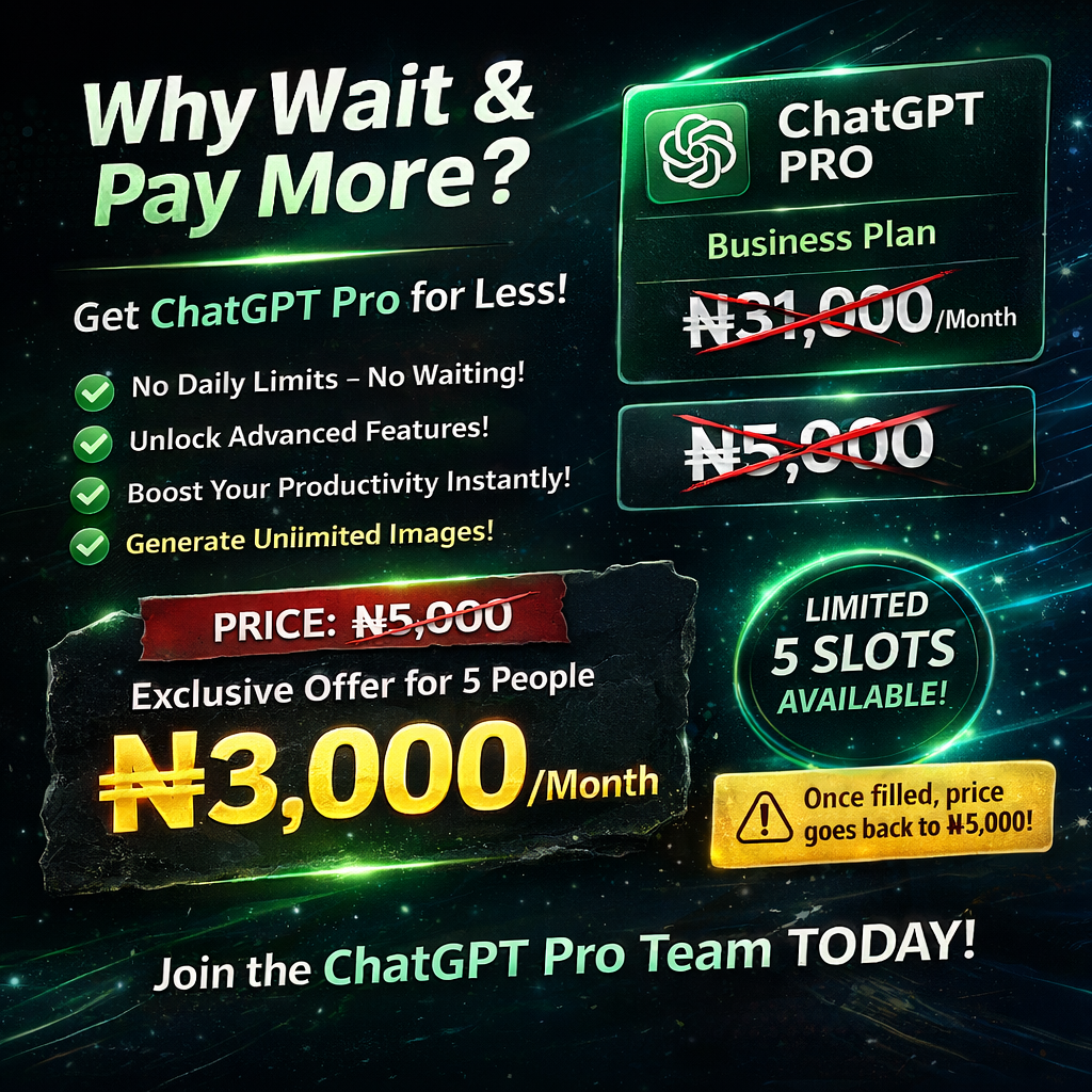 Stop settling for limits. With ChatGPT Pro, you work faster, create more, and stay ahead without interruptions. ?? Unlimited access ?? Faster, smarter output ?? Content & image creation anytime Instead of paying ?5,000+, get access today for just ?3,000/monthly. Limited to 5 people only.